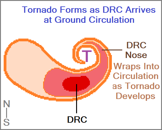 At left, the position of the DRC and DRC’s nose have been marked relative to the vorticity feeder on a graphic by Ted Fujita in 1978. 28 Without seeing Fujita’s schematic, a nearly identical DRC structure is show at right from a study in 2022. 29 The two graphics were drawn 44 years apart, and are in remarkable agreement.