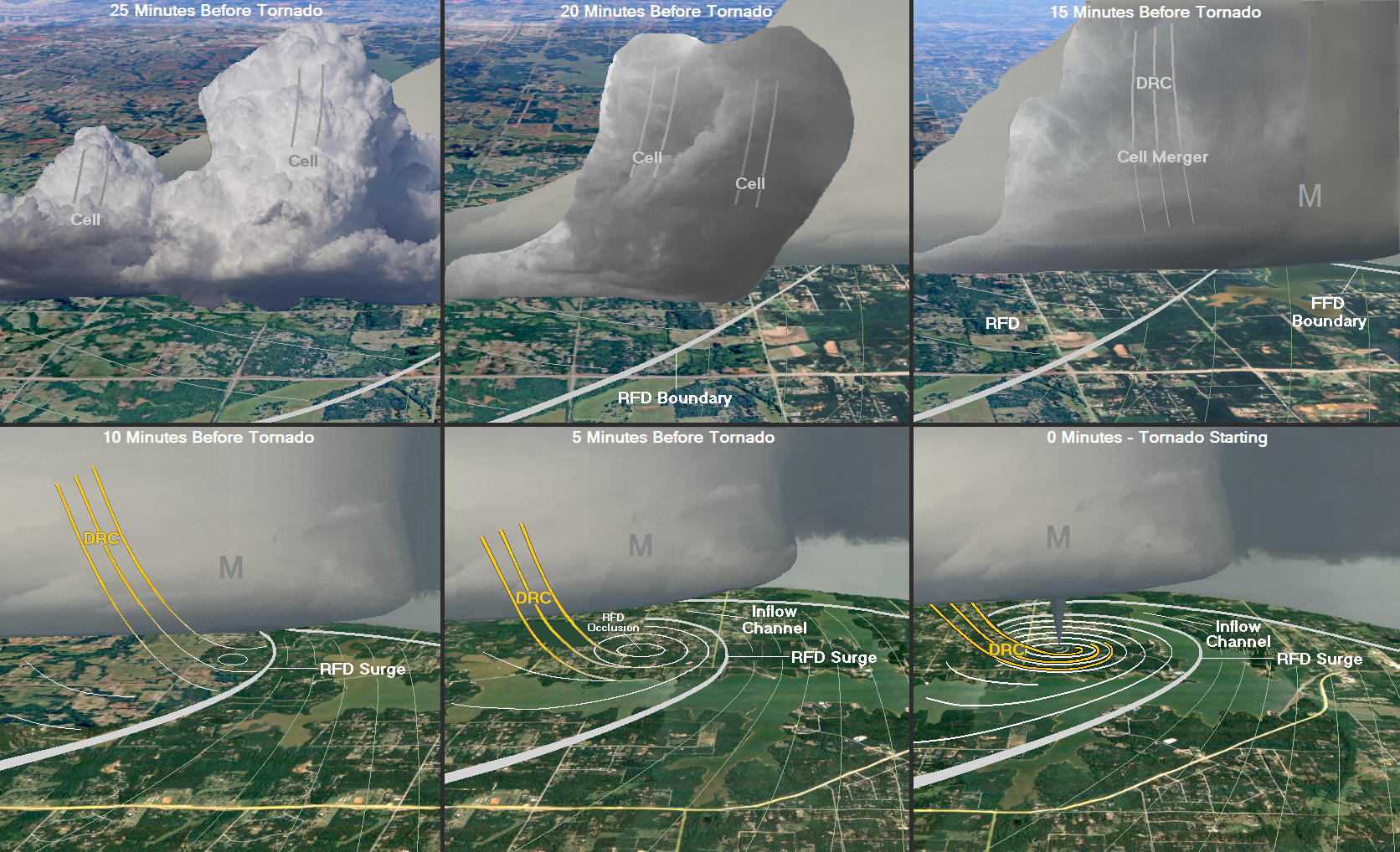 From five to ten minutes before the violent tornado, the RFD occlusion deepens as random vorticity patches form and move around the surface low. From zero to four minutes before the tornado, the DRC reaches the ground to the west-southwest of the RFD occlusion. At this time, surface rotation markedly increases with a more concentrated zone of vorticity generation developing along the inside edge of the DRC. This is what is called the vorticity feeder, which Ted Fujita first described in the mid 1970s, after he examined the damage produced by violent tornadoes in the historic April 3-4, 1974 Super Outbreak. 23 With some violent tornadoes, damage from the DRC can be seen starting to the west-southwest of the tornado damage, along with evidence of the vorticity feeder. This feature is located along the northern edge of the DRC, where a localized pressure drop occurs on the side closest to the meso. The DRC helps to keep the developing axis of vertical vorticity aligned with the low-level meso, 24 and acts as a blocking mechanism to protect the vortex from being torn apart by low-level shear. As the nose of the DRC wraps around the RFD occlusion, it acts like a wall with a vertically oriented curl of rotation developing on its lee side. The tornado forms as vorticity is amplified within this curl of rotation, 25 with the column of vorticity developing upward very quickly starting near the ground. 26 During the few minutes leading up to the tornado, the inflow channel gradually moves around the north and west side of the RFD. An inflow channel connection is often made just as the tornado is starting. The inflow channel provides the new tornado with an ideal source of moisture and instability, and supports the tornado as it intensifies, eventually into a violent vortex.